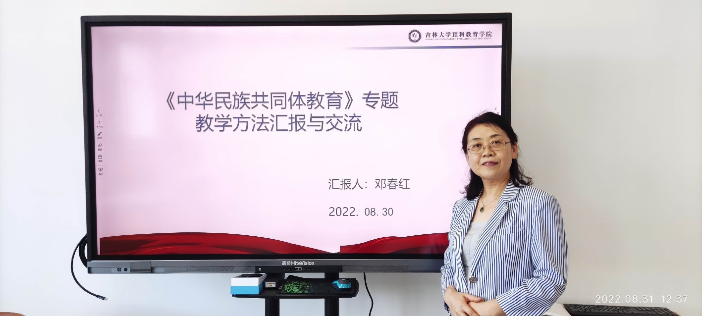 邓春红老师本次分享的主题是《中华民族共同体教育》专题的教学方法。她介绍了根据课程内容和预科学生特点所采用的自主学习教学法、情境式教学法、案例教学法、实践活动教学法、探究式教学法,展示了教学效果和学生反馈,并谈了自己在教学实践中的体会和感悟。